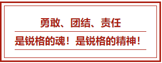 勇敢--敢于拼搏是銳格發(fā)展的根。不管遇到多少困難,面對多大的壓力,我本人和我們的團隊從來沒有妥協(xié)過,動搖過,沒有畏懼過。沒有越挫越勇的精神,就沒有今天的銳格!